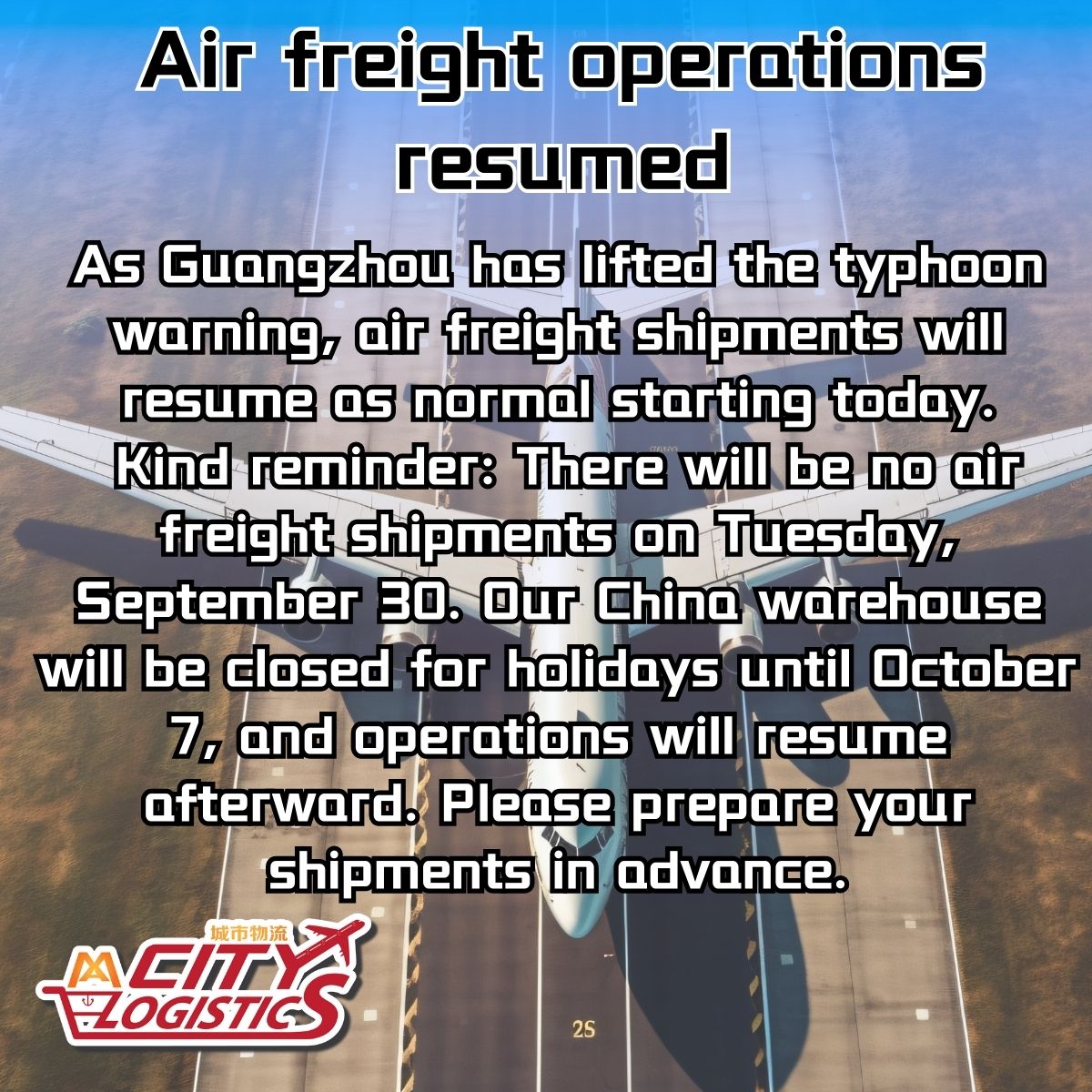 As Guangzhou has lifted the typhoon warning, air freight shipments will resume as normal starting today. Kindly be informed, thank you.