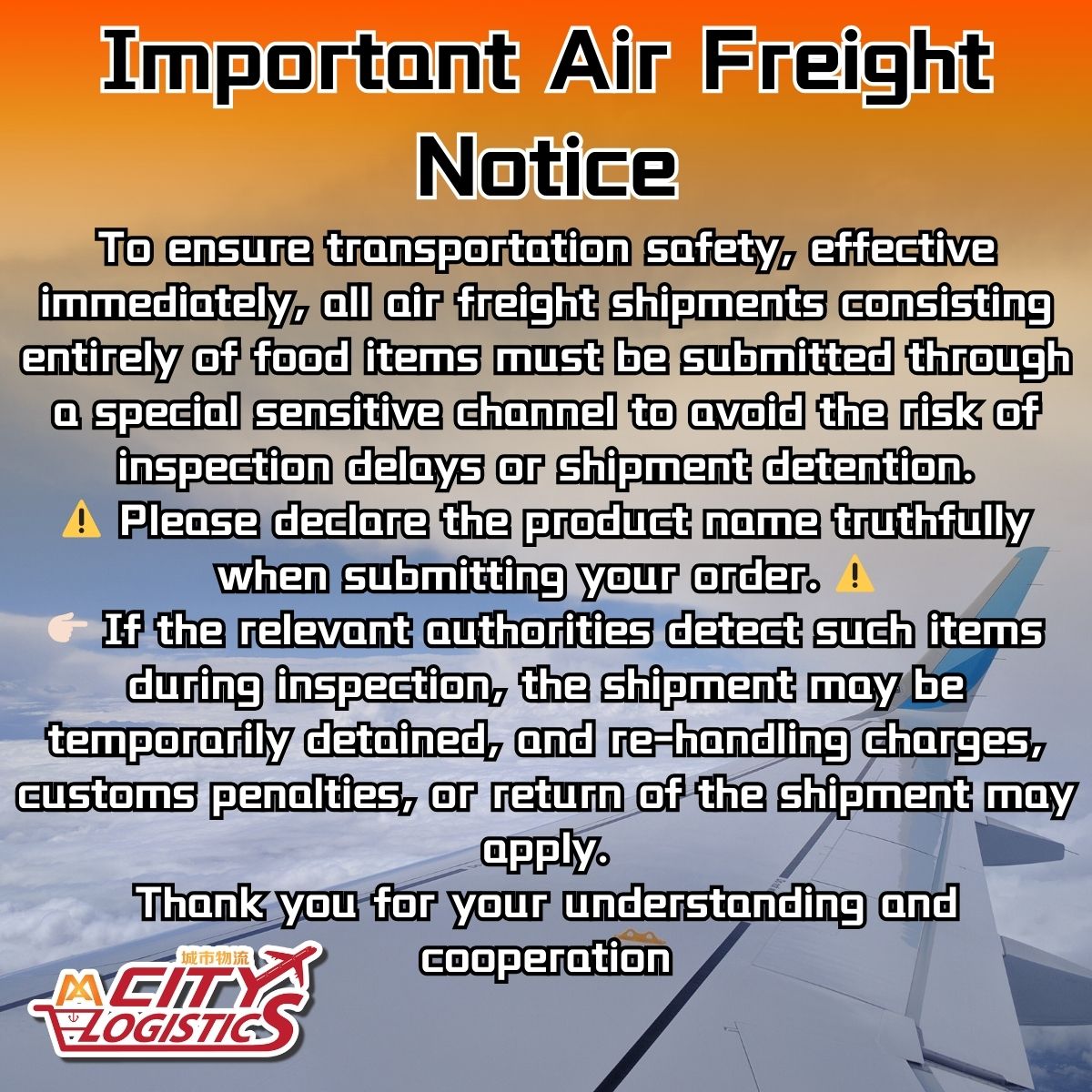 To ensure transportation safety and reduce the risk of shipments being detained, effective immediately, all air freight shipments that consist entirely of food items must be submitted through our “Special Sensitive Channel.”