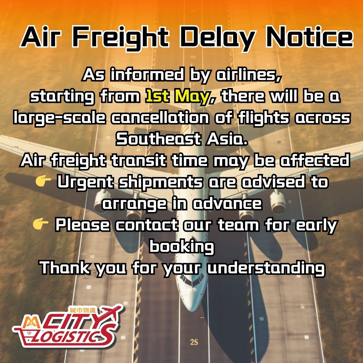 As informed by the airlines, starting from 1st May, there will be a large-scale cancellation of flights across Southeast Asia. This is expected to impact overall air freight transit times.